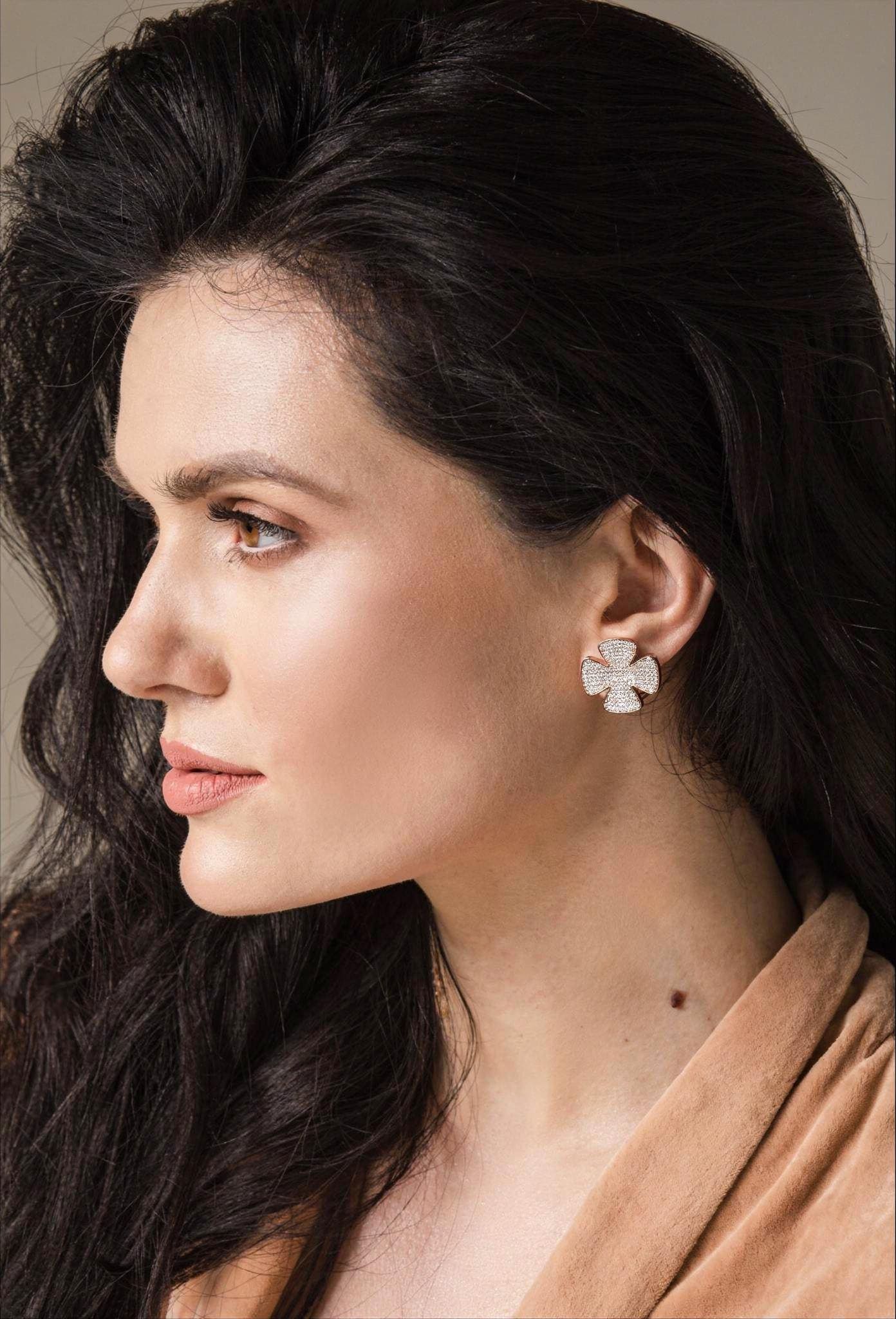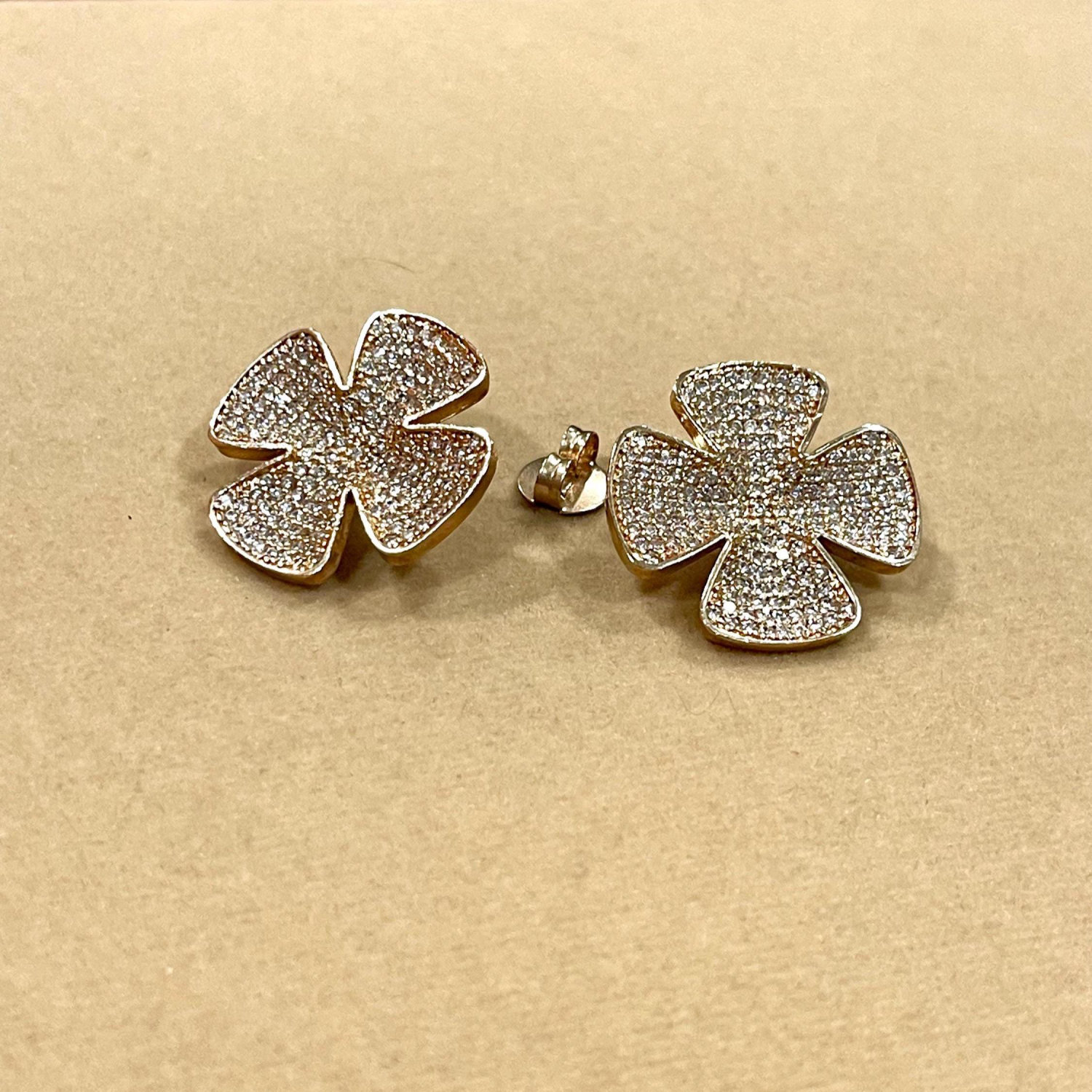 These Gold Pave Clover Stud Earrings are a masterclass in modern luxury. Featuring a classic four-leaf silhouette reimagined with a high-glamour finish, these studs offer a “crushed diamond” effect that provides a continuous wall of shimmer from every angle.