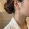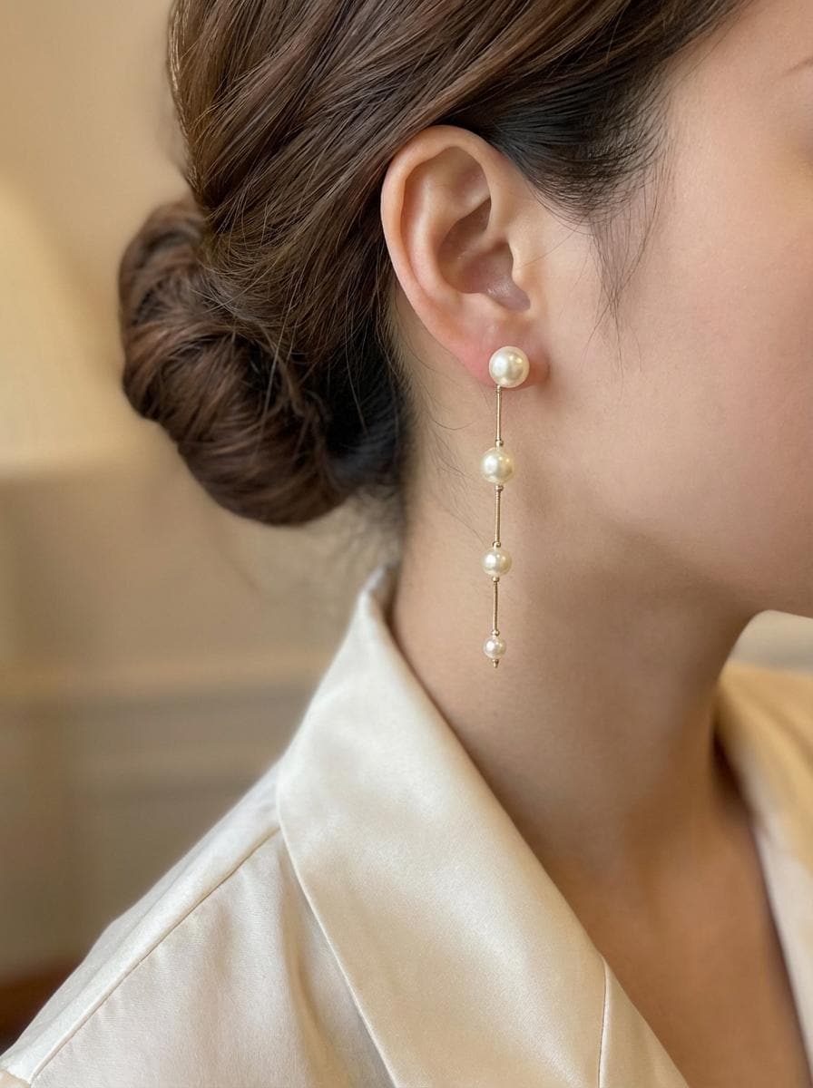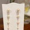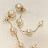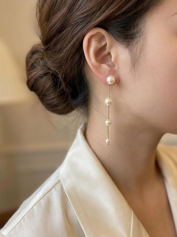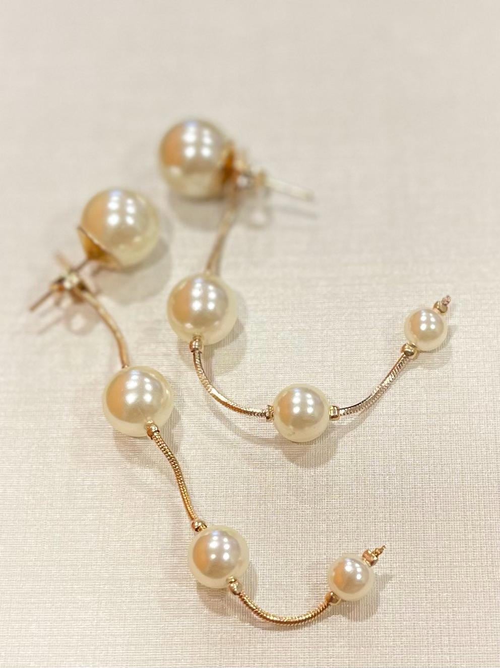 Make a sophisticated statement with these stunning pearl drop earrings. Featuring a unique, fluid design, these earrings combine the classic luster of cream pearls with a delicate 18k gold-filled chain. The graduated pearl sizes create a graceful visual flow that elongates the neck and adds a touch of luxury to any ensemble.
