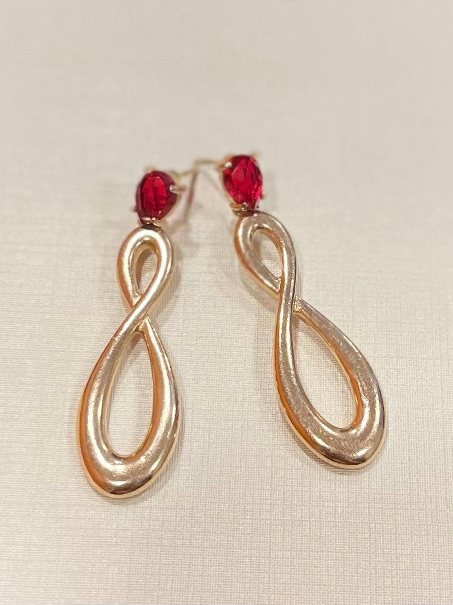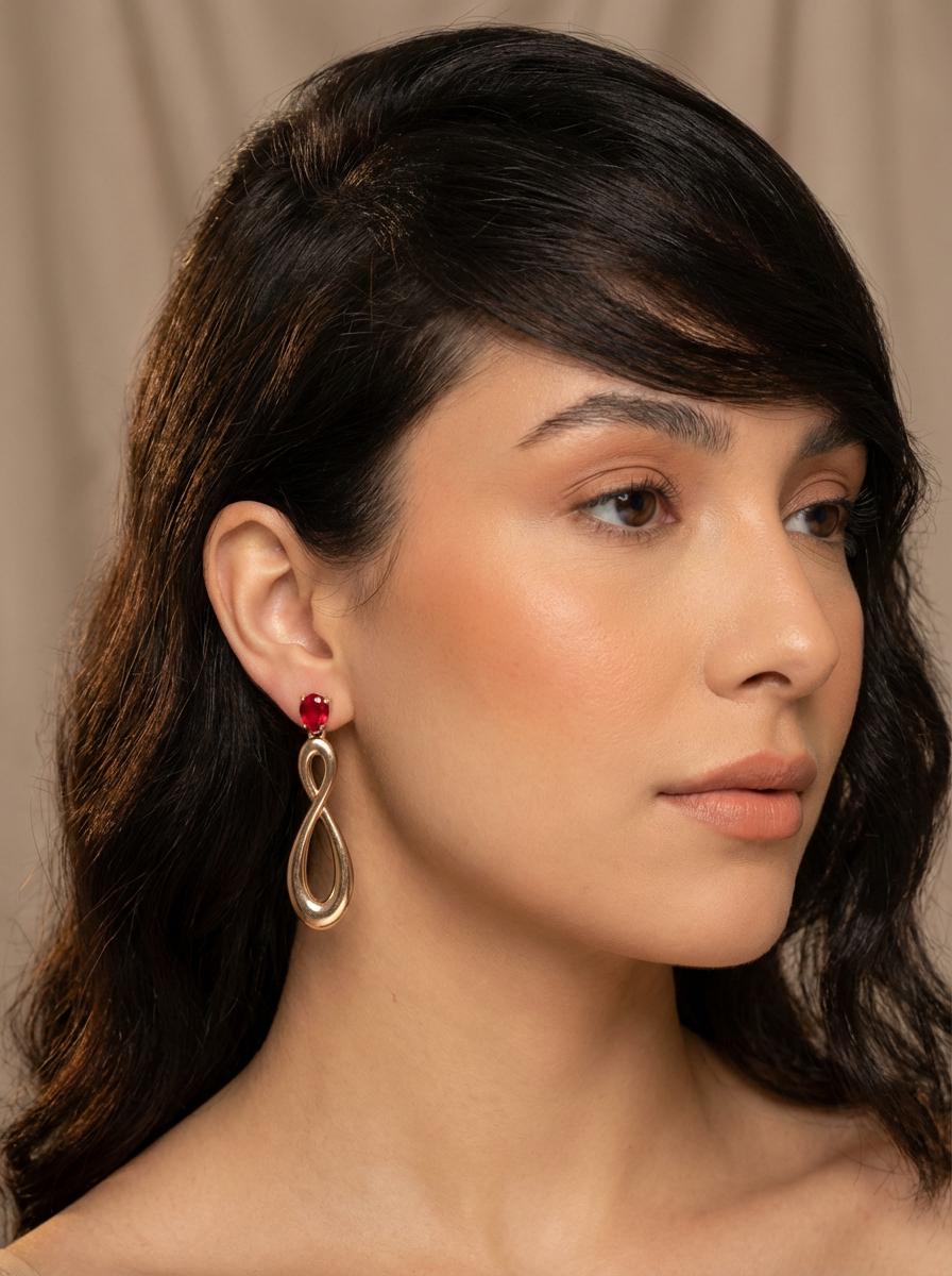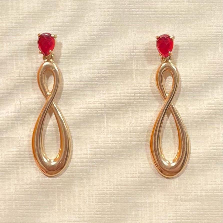 Make an unforgettable statement with these striking infinity-loop drop earrings. Featuring a vibrant, faceted ruby-red stone set at the post, these earrings flow into a polished, twisted silhouette. The elongated figure-eight design creates a sense of movement and “everlasting” style, making them as meaningful as they are beautiful.