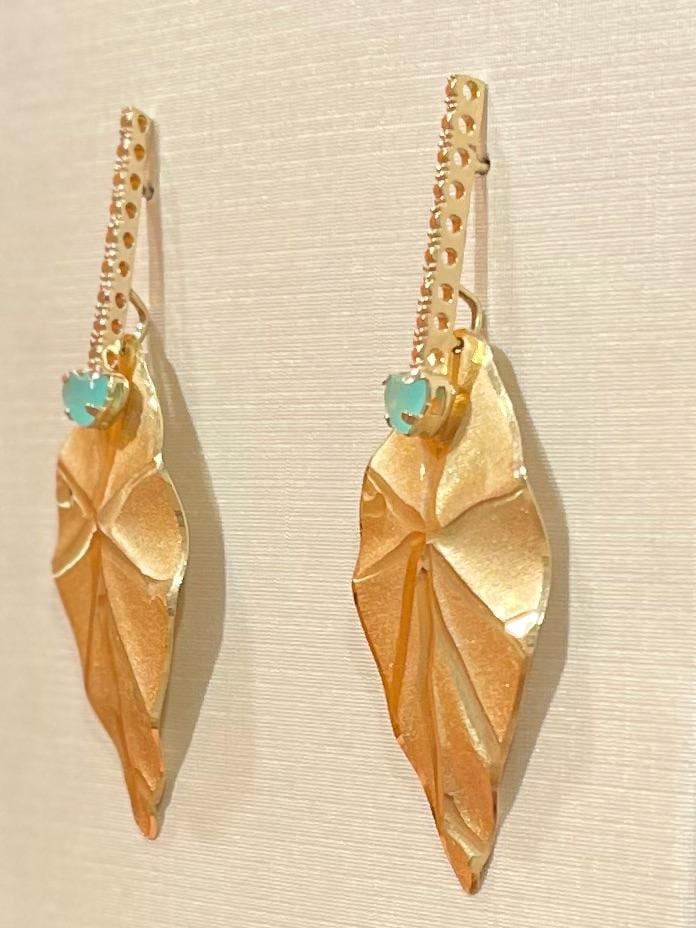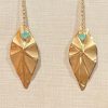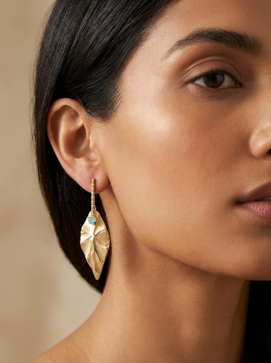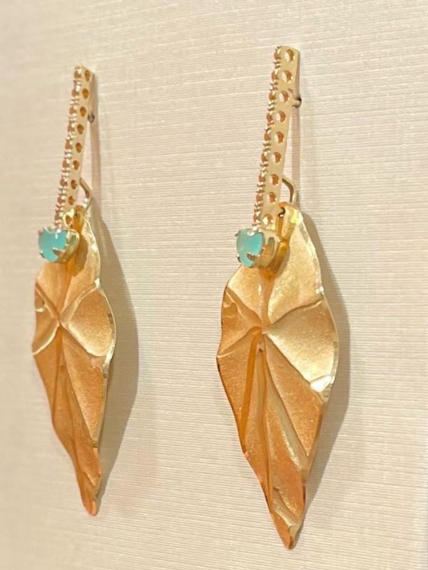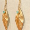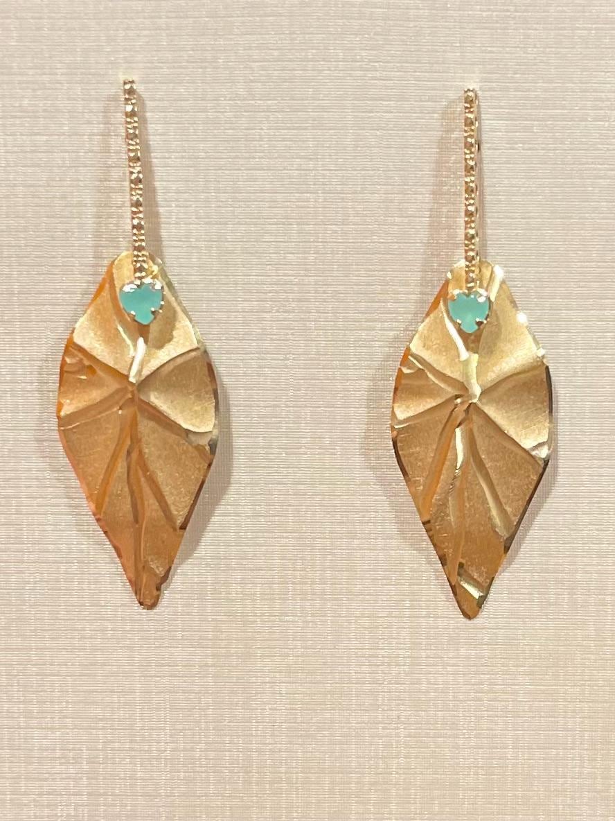 A bar dangles elegantly, leading the eye to a sculptural, matte gold-toned leaf. Nestled at the top of each leaf is a charming turquoise-hued heart stone, adding a delightful pop of color to this sophisticated design.