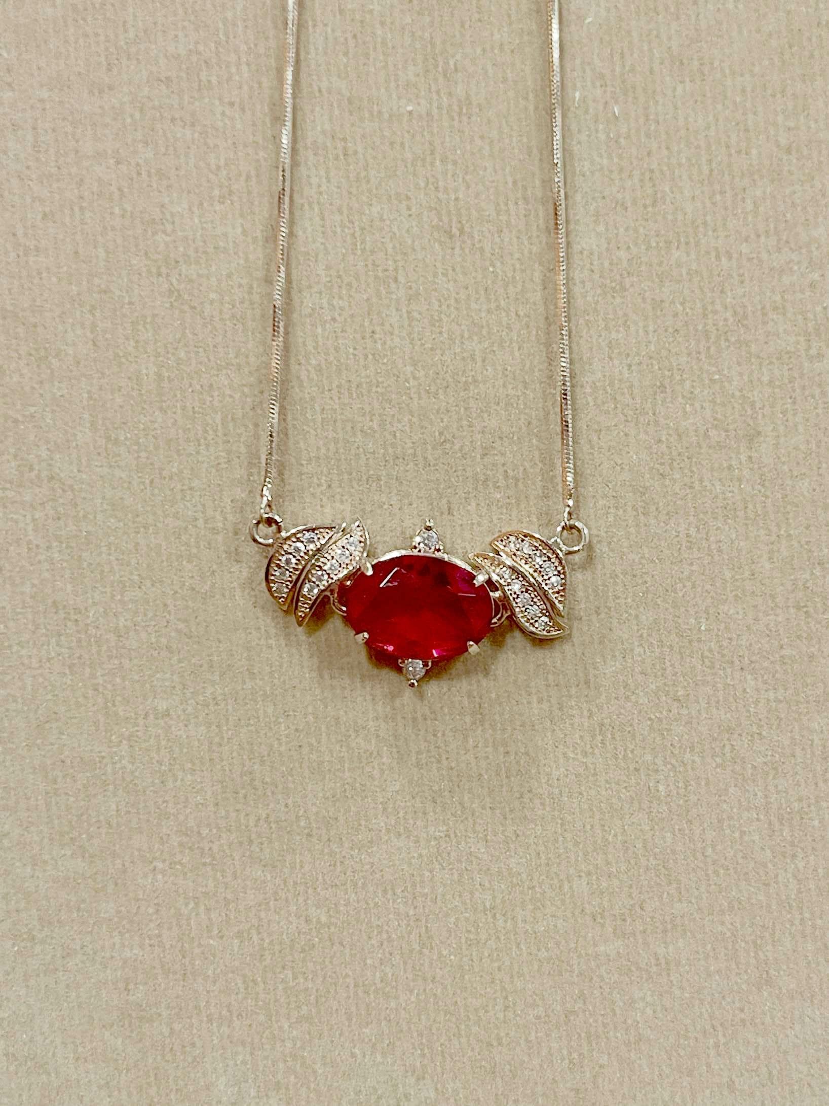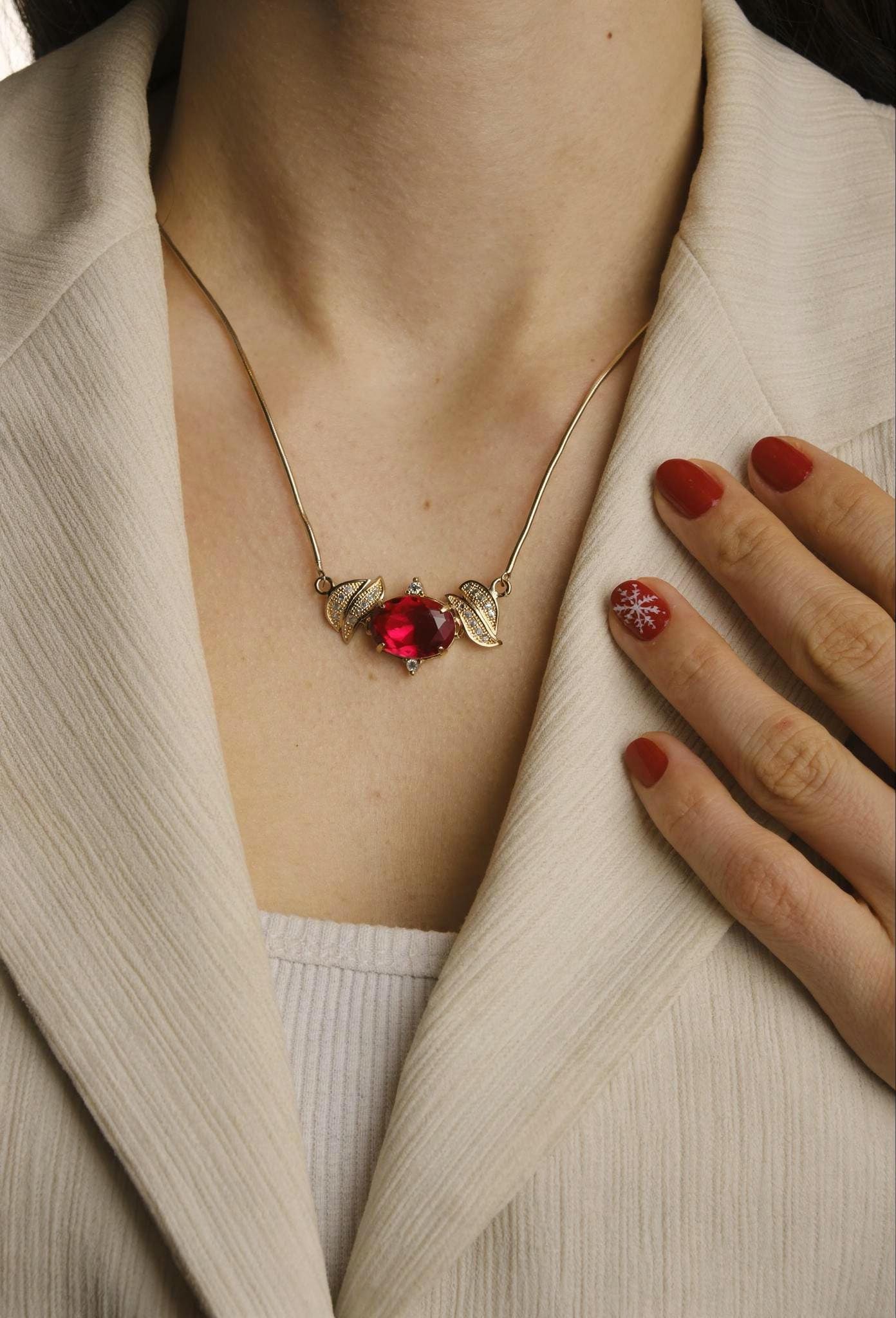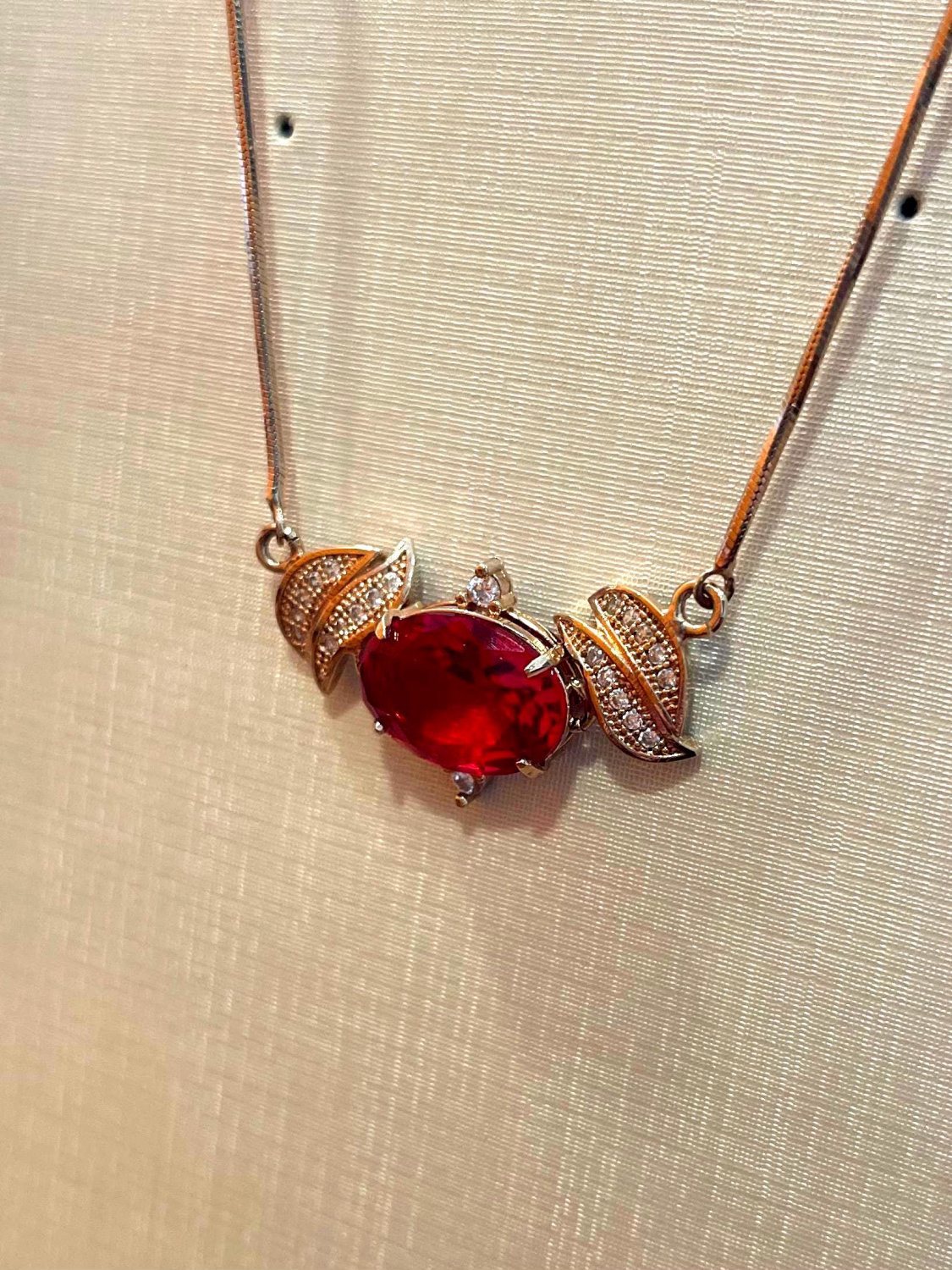 Red synthetic stone centerpiece with leaf-shaped accents pavé-set with cubic zirconia.