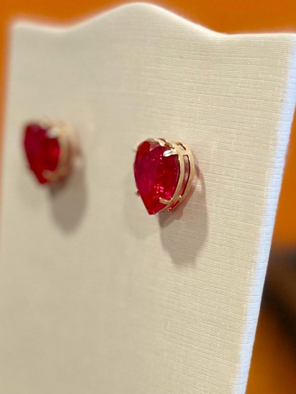 Featuring a specialized “crushed ice” cut, these vibrant stones offer an intense, multi-dimensional sparkle that shimmers from every angle. The deep crimson hue is perfectly complemented by a minimalist gold-filled prong setting, ensuring the focus remains on the brilliant, faceted heart shape.