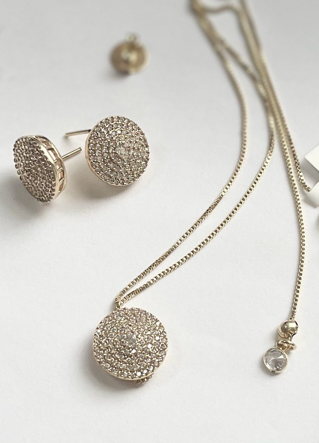 Earrings and pendant. Encrusted with sparkling cubic zirconia, this set brings together the perfect combination of luxury, sophistication, and radiant beauty, making it the ideal choice for any occasion—whether it’s a formal evening, a special celebration, or an everyday touch of elegance.