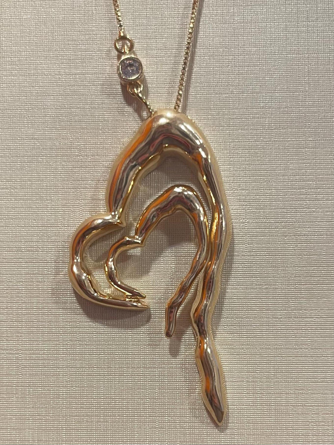 This pendant offers a fluid, abstract take on the classic heart silhouette, featuring a molten, organic aesthetic that feels both artistic and feminine.