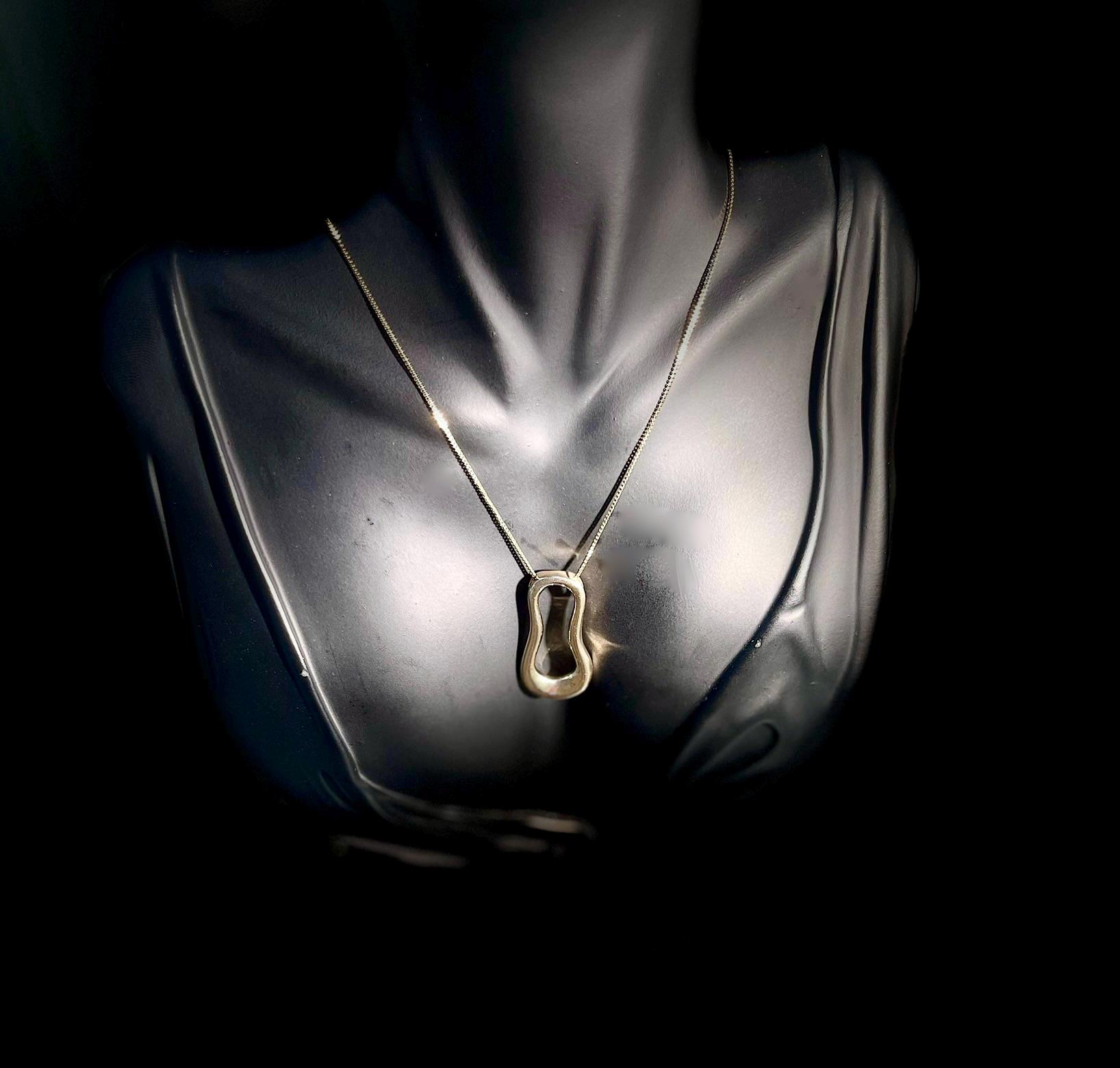 A piece defined by its fluid, liquid-gold silhouette. Moving away from traditional geometric shapes, this pendant features an elongated, sculptural “loop” design that celebrates soft lines and high-polish reflection.