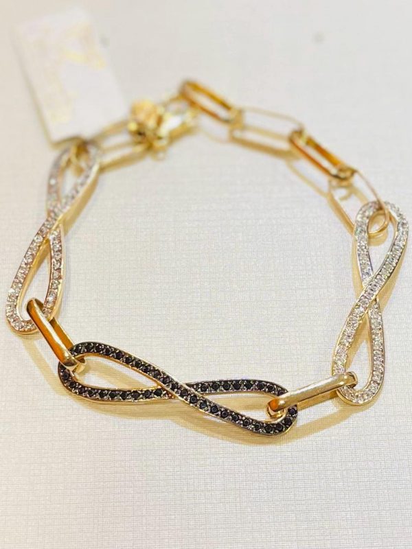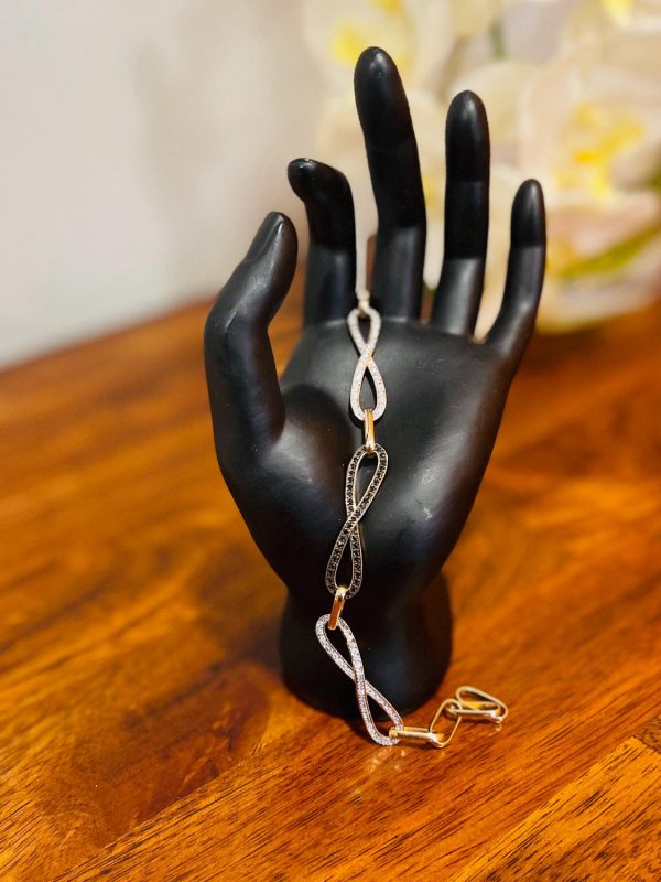 This striking bracelet offers a contemporary take on the classic infinity motif. Featuring a unique combination of high-contrast accents and sleek hardware, it’s designed for those who appreciate jewelry with a strong, modern edge.
